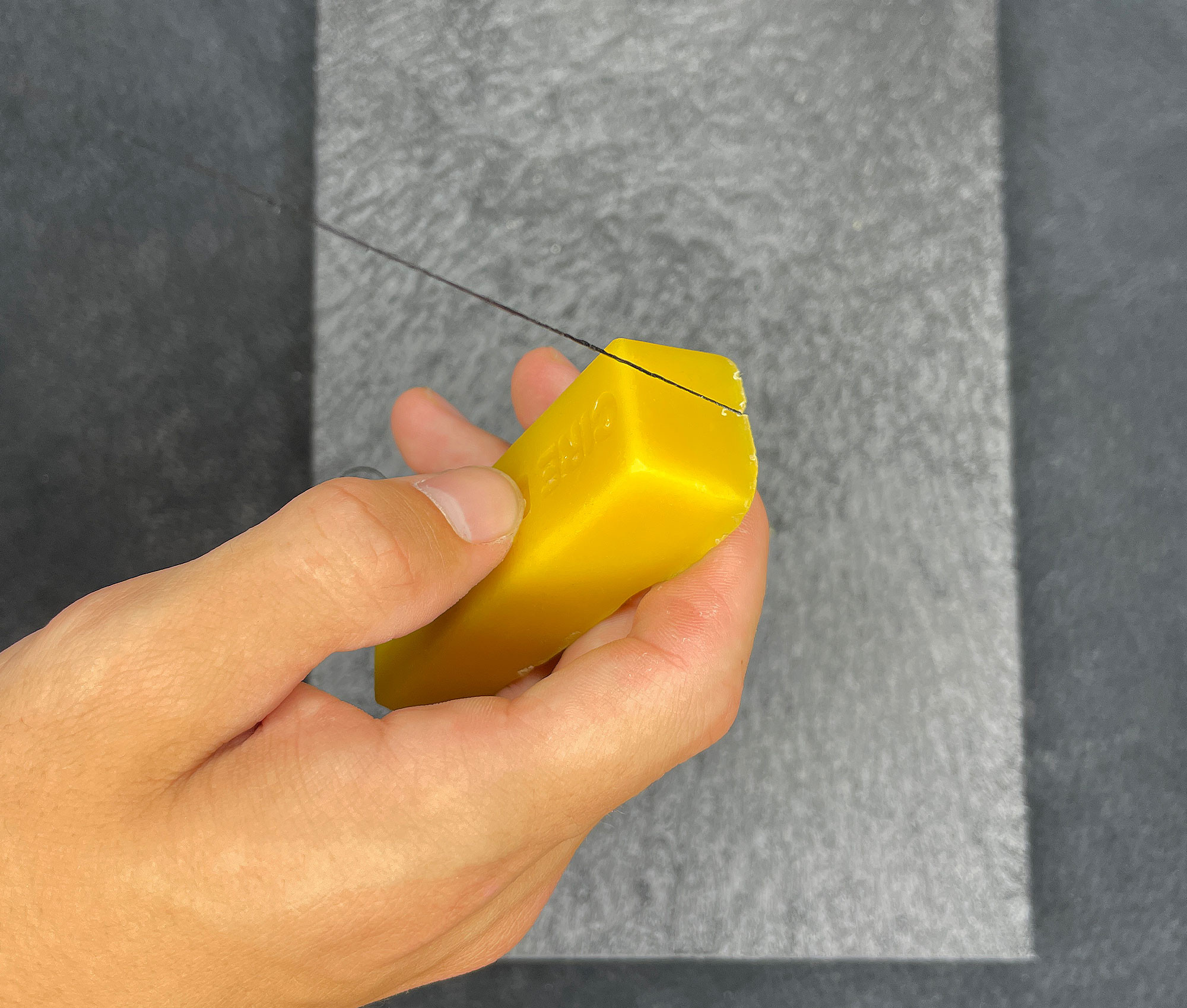 Pour le fil, passez le plusieurs fois en entier en le coinçant entre le pain de cire et votre pouce pour bien l’imprégner.