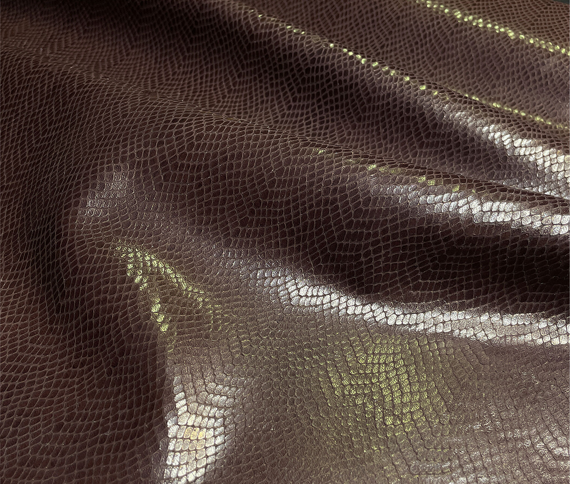 Ces peaux de chèvre grain serpent ont un bel effet 2 tons avec les écailles brillantes et les intervalles mats. Ce cuir est assez souple avec une certaine tenue.