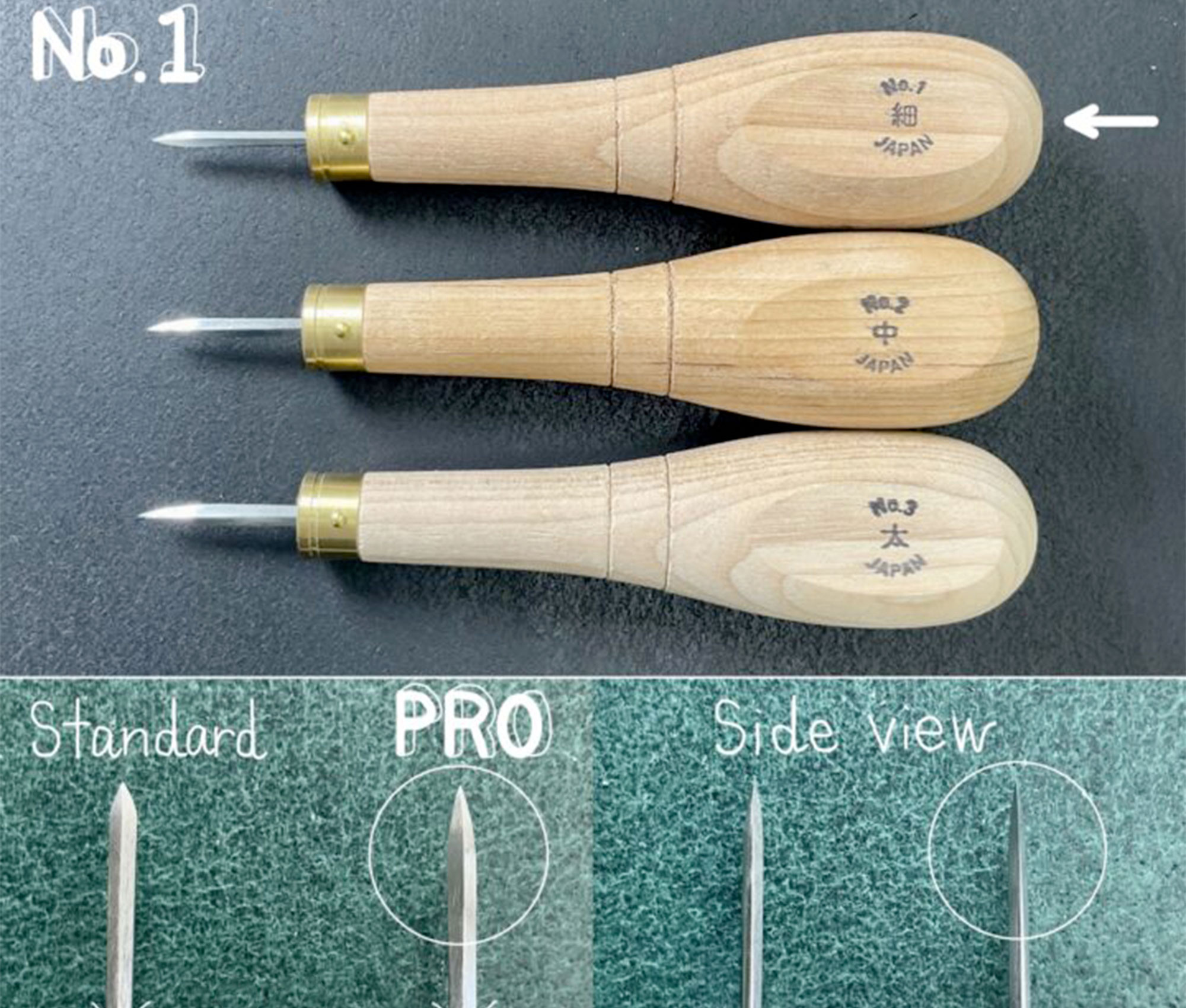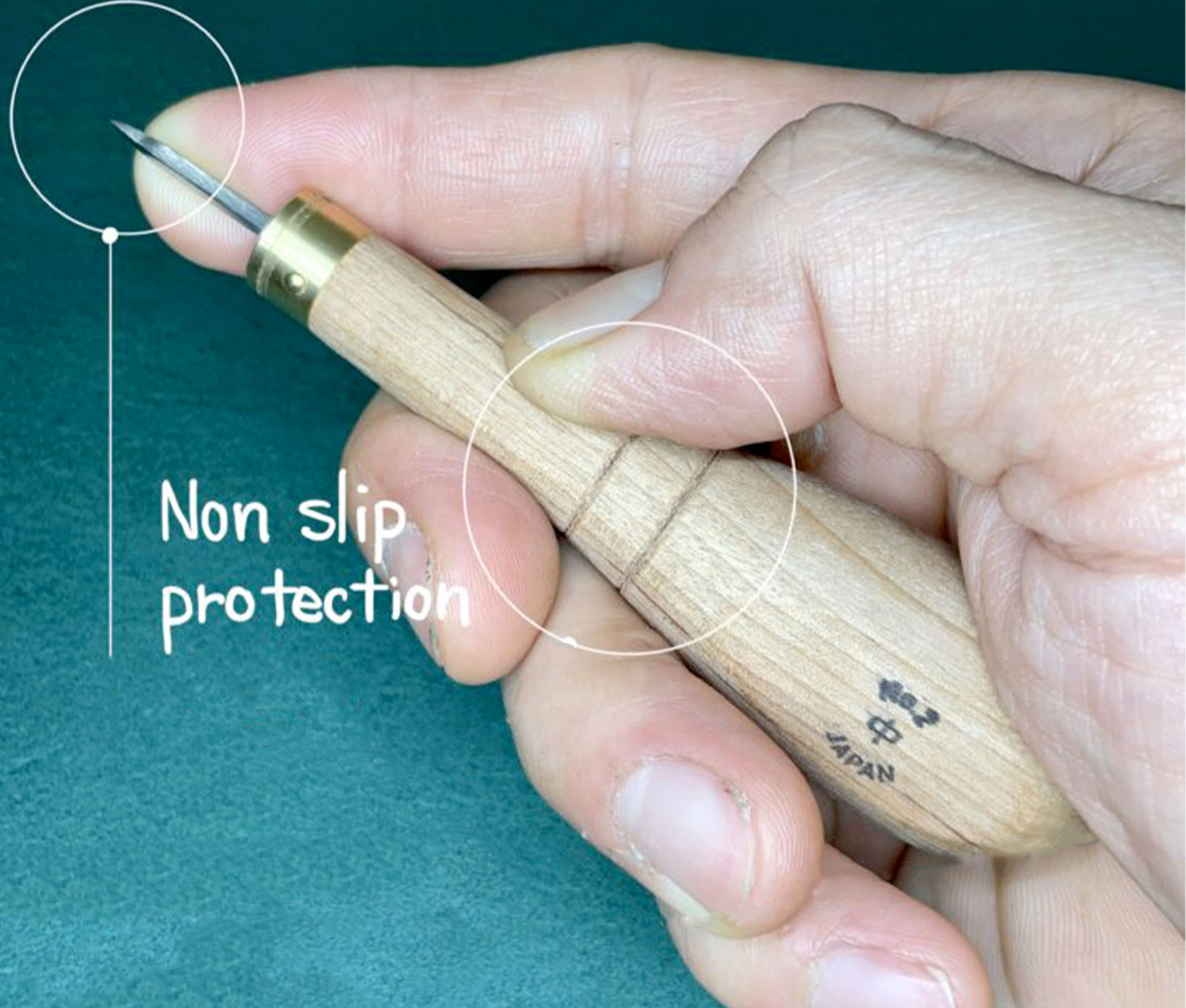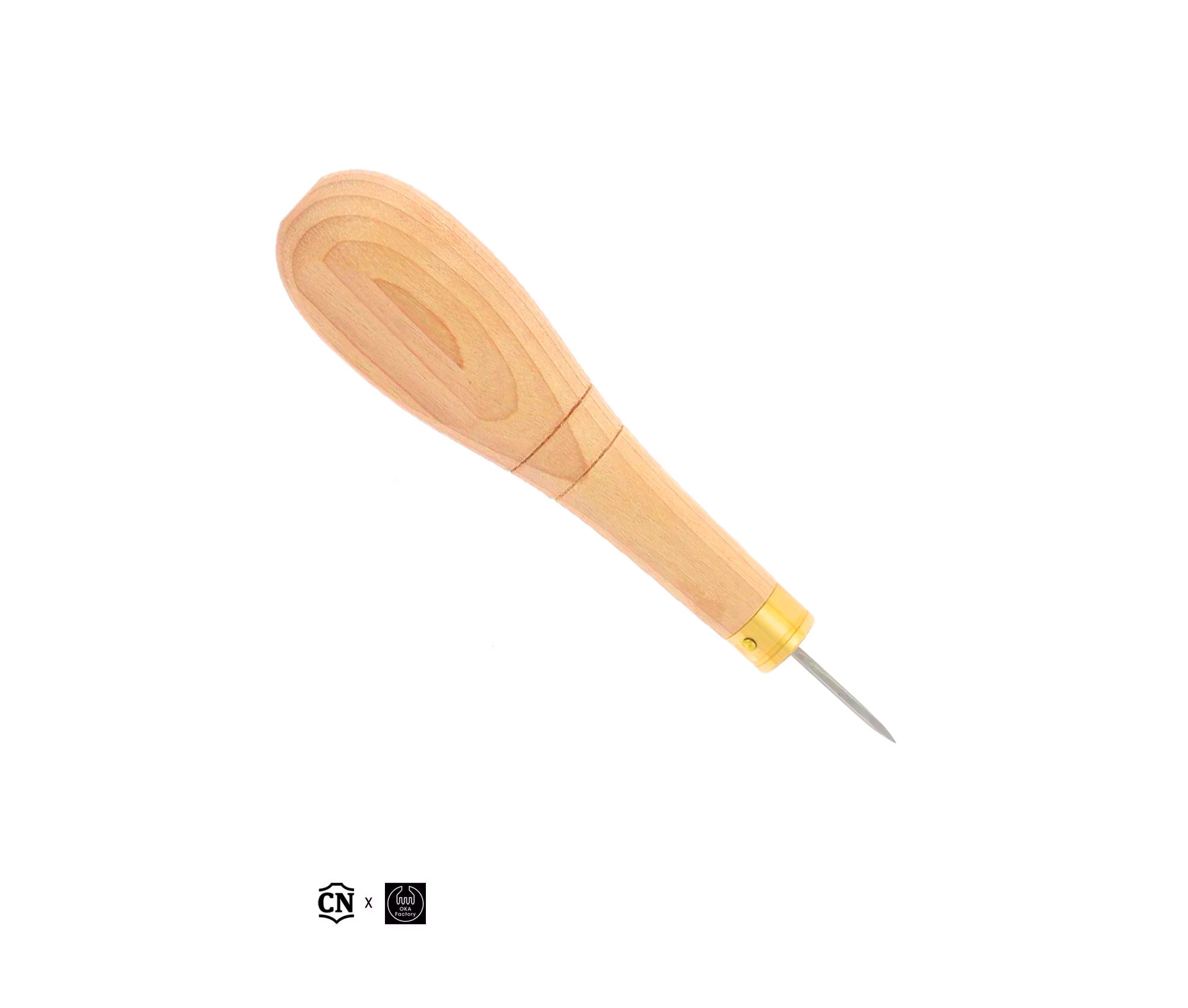 - Le manche est en bois japonais ostryer, un matériau dur et durable. Le manche n'est pas verni pour absorber la sueur de la main et garder du confort. Les lignes tracées dans le bois favorisent le maintien de l'alène avec le pouce et l'index.