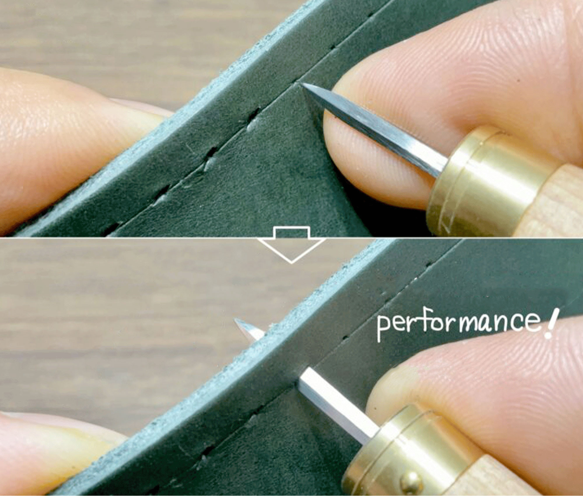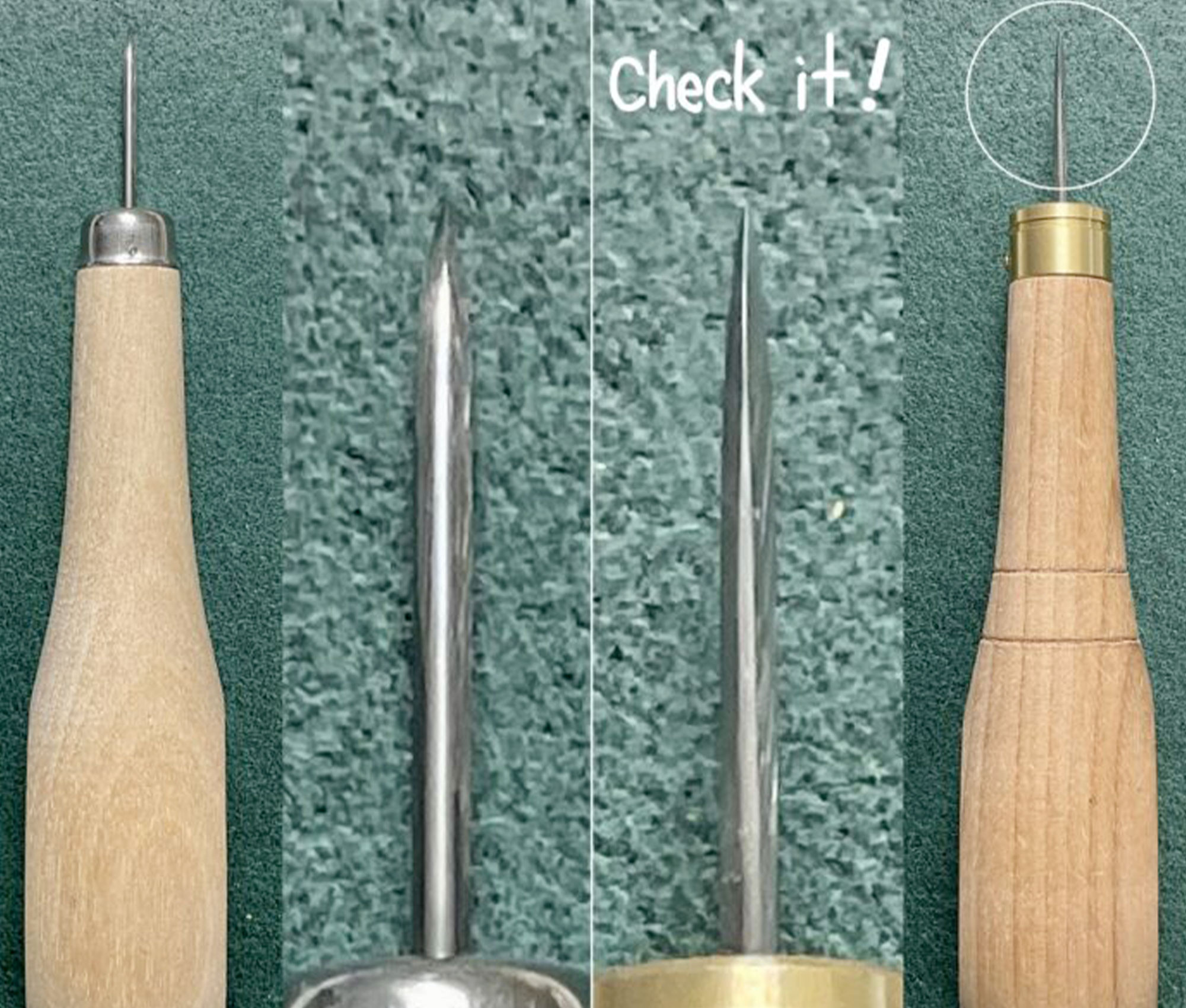 - La lame est finie à la main pour optimisé le tranchant, par rapport à l'alène classique de chez OKA, le bout est plus pointu et les cotés plus aiguisés pour réduire la force pour entrer et sortir l'alène dans le cuir. La lame est en acier trempé pour plus de résistance.
