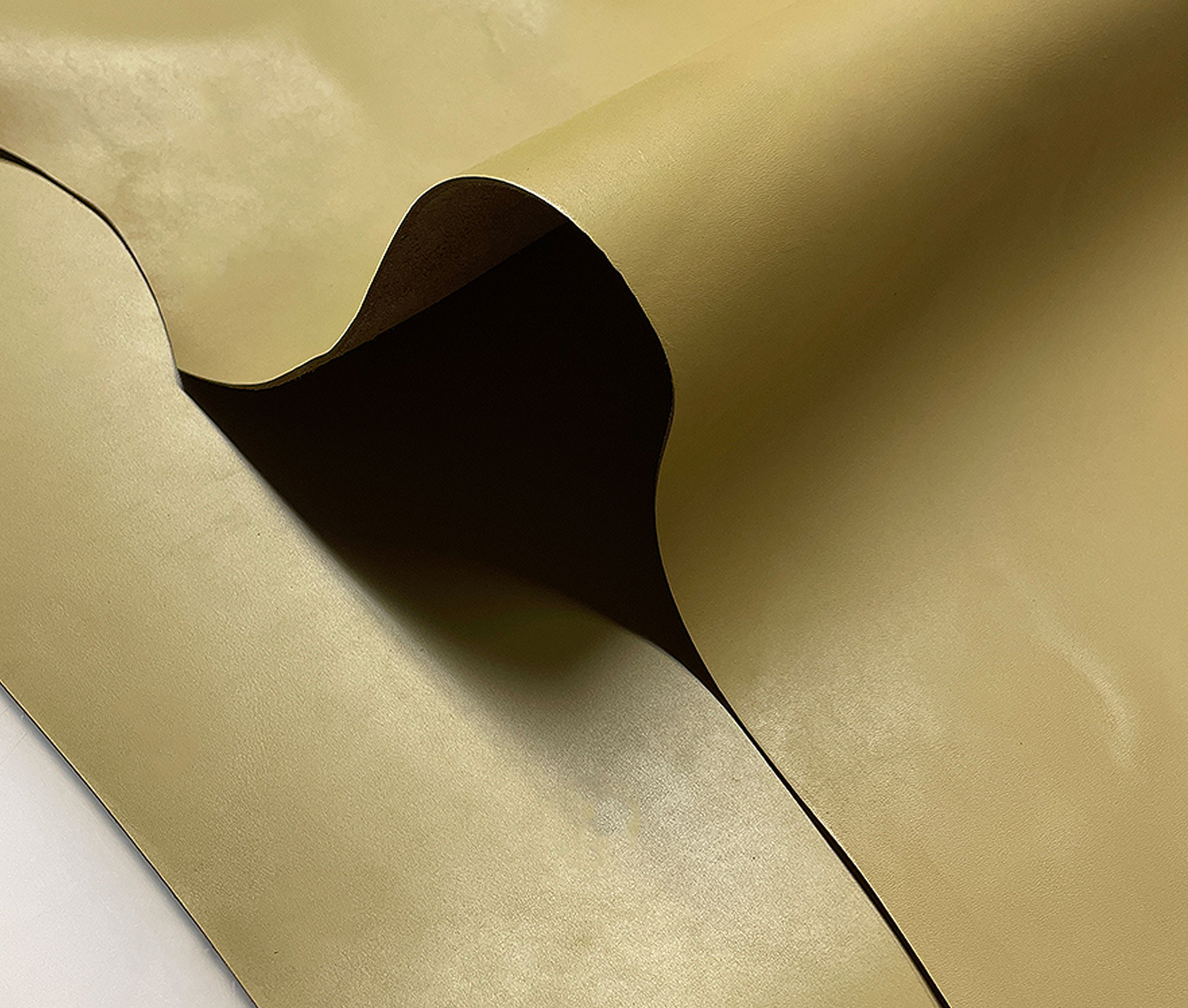 Demi-peau de veau lisse Kaki, le produit est plutôt ferme et peut être utilisé pour la maroquinerie, la petite maroquinerie, ou autres loisirs créatifs.