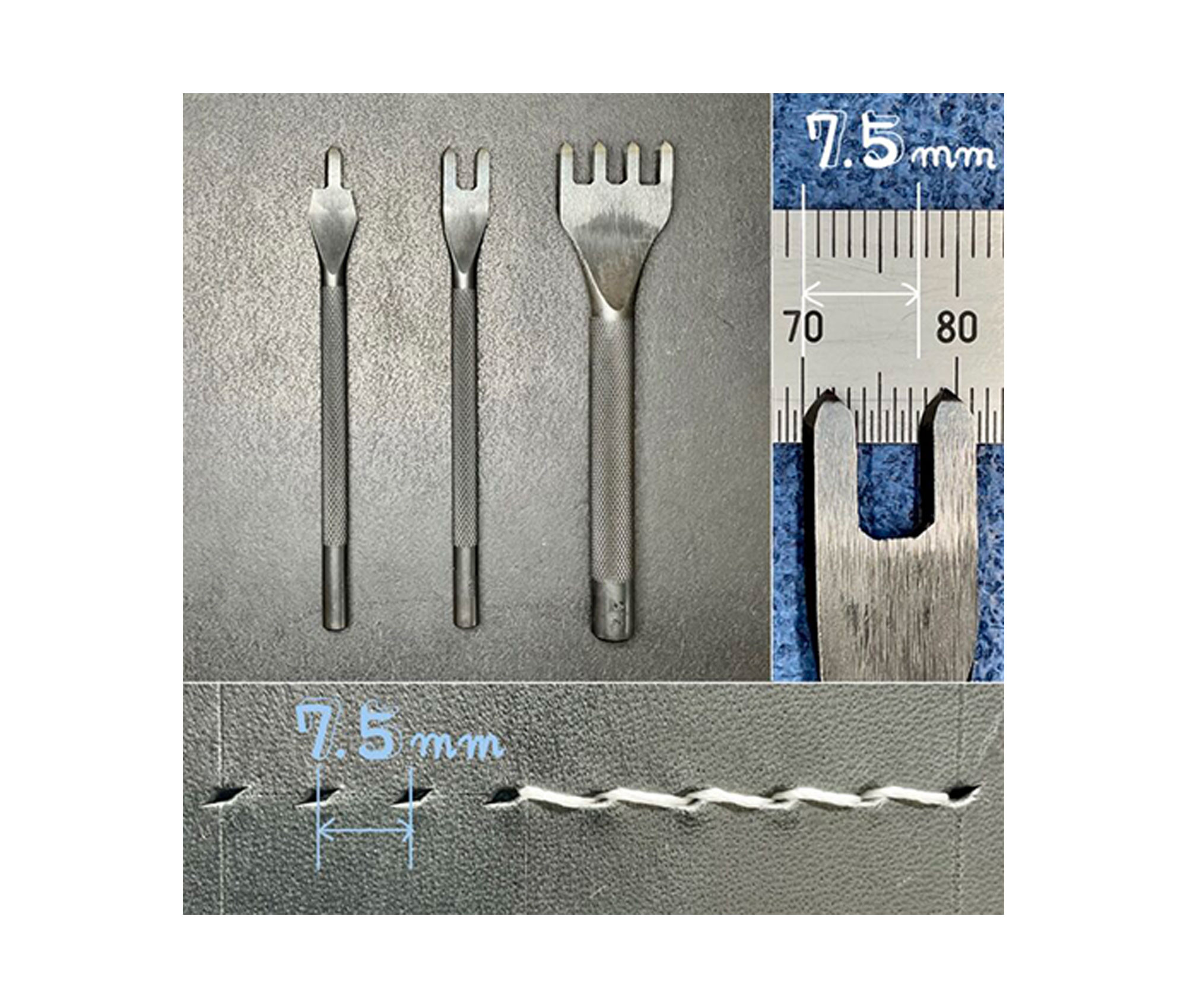 Un maillet ou maul vient appuyer sur les griffes qui vont marquer le cuir à intervalle régulier. Ces mêmes marques, déjà tracées par les griffes, vont ensuite être percées par des alênes pour vous permettre de passer votre fil et vos aiguilles en suivant. Ainsi, ces techniques permettent de créer des points de couture parfaits.