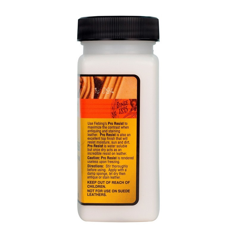 Le Fiebing’s Pro Resist est une finition spécialement pensée pour augmenter le contraste de votre patine ou de votre teinture. En effet, ce fixateur, à appliquer après la teinture, est imperméabilisant, protège également du soleil ainsi que de la saleté. Il faut bien attendre que la teinture soit sèche avant d'appliquer le produit.