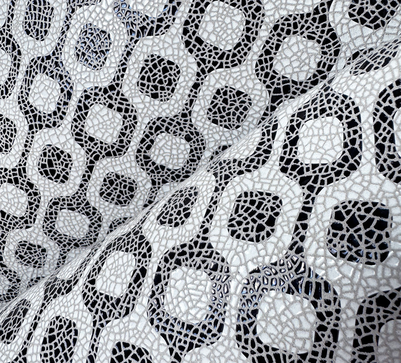 Add a vintage and graphic touch to your creations with this beautiful fancy goat leather featuring a retro cracked pattern. Its elegant contrast of white and black gives it a bold style, perfect for original and trendy projects.