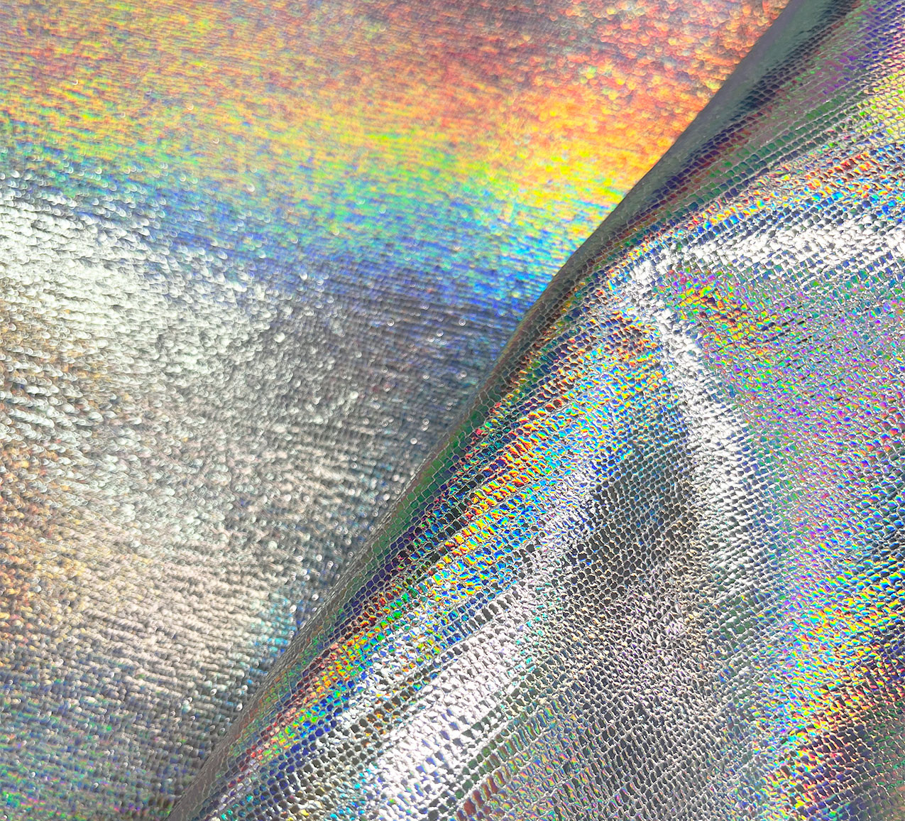 This leather features a vibrant silver finish, enhanced by subtle multicolored reflections that shift with the light. Soft and easy to work with, it’s perfect for crafting unique pieces such as leather goods, jewelry, accessories, custom designs, or small creative cutouts.