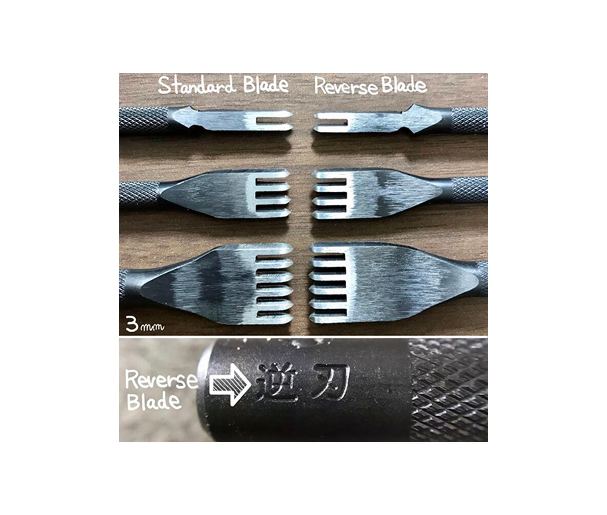 The reversed diamond iron are used to mark stitching points on leather. This is the same tool as the classic diamond iron, but they are symmetrical (see image).