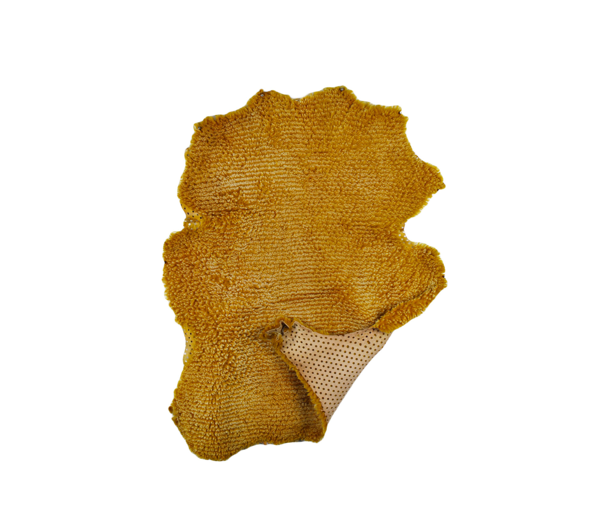 Very beautiful yellow orange perforated lambskin with dense curly fur and a wool length between 1 and 2 cm.