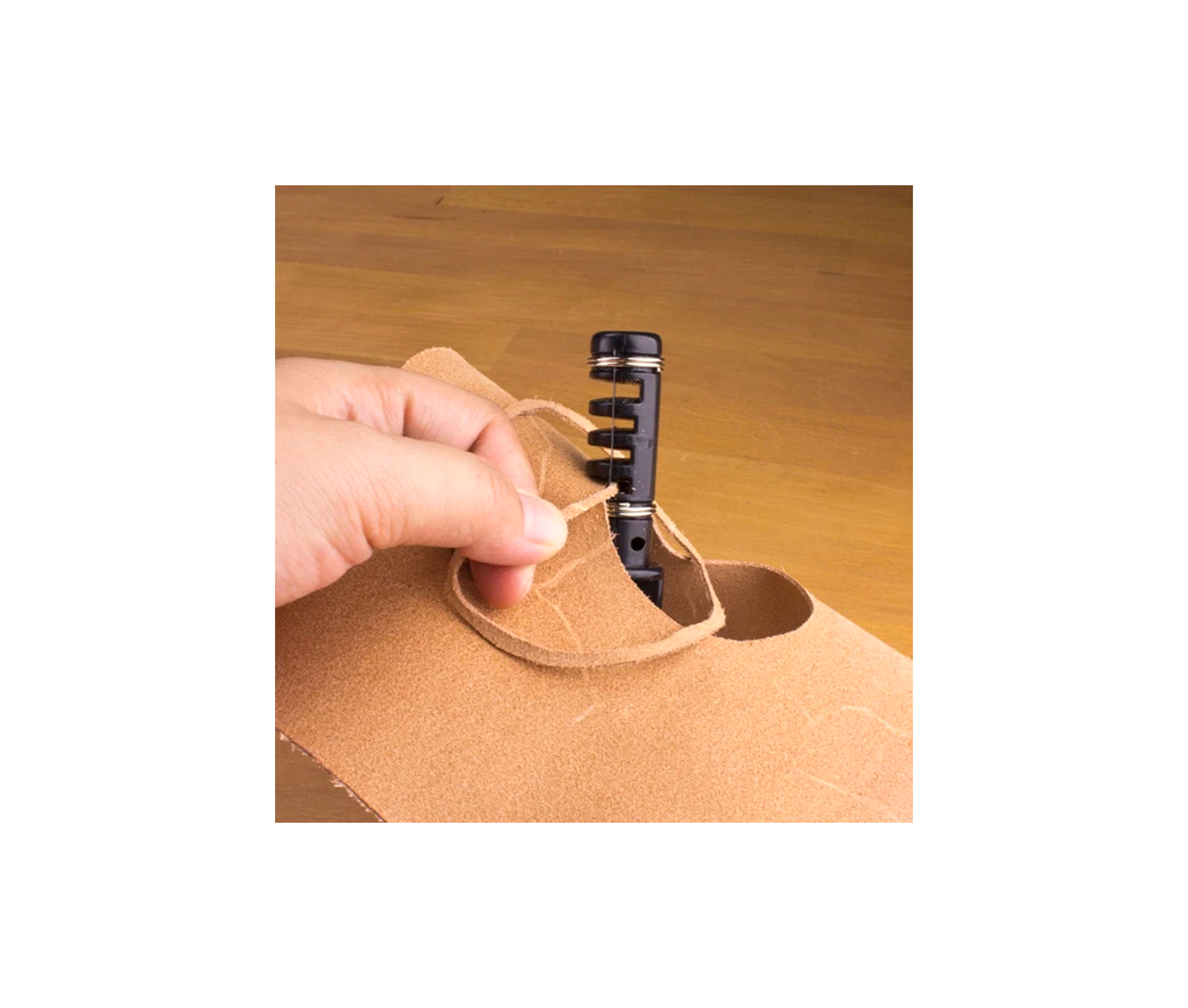 - Using a steady, circular motion, cut through the leather while keeping the lace in the slot.