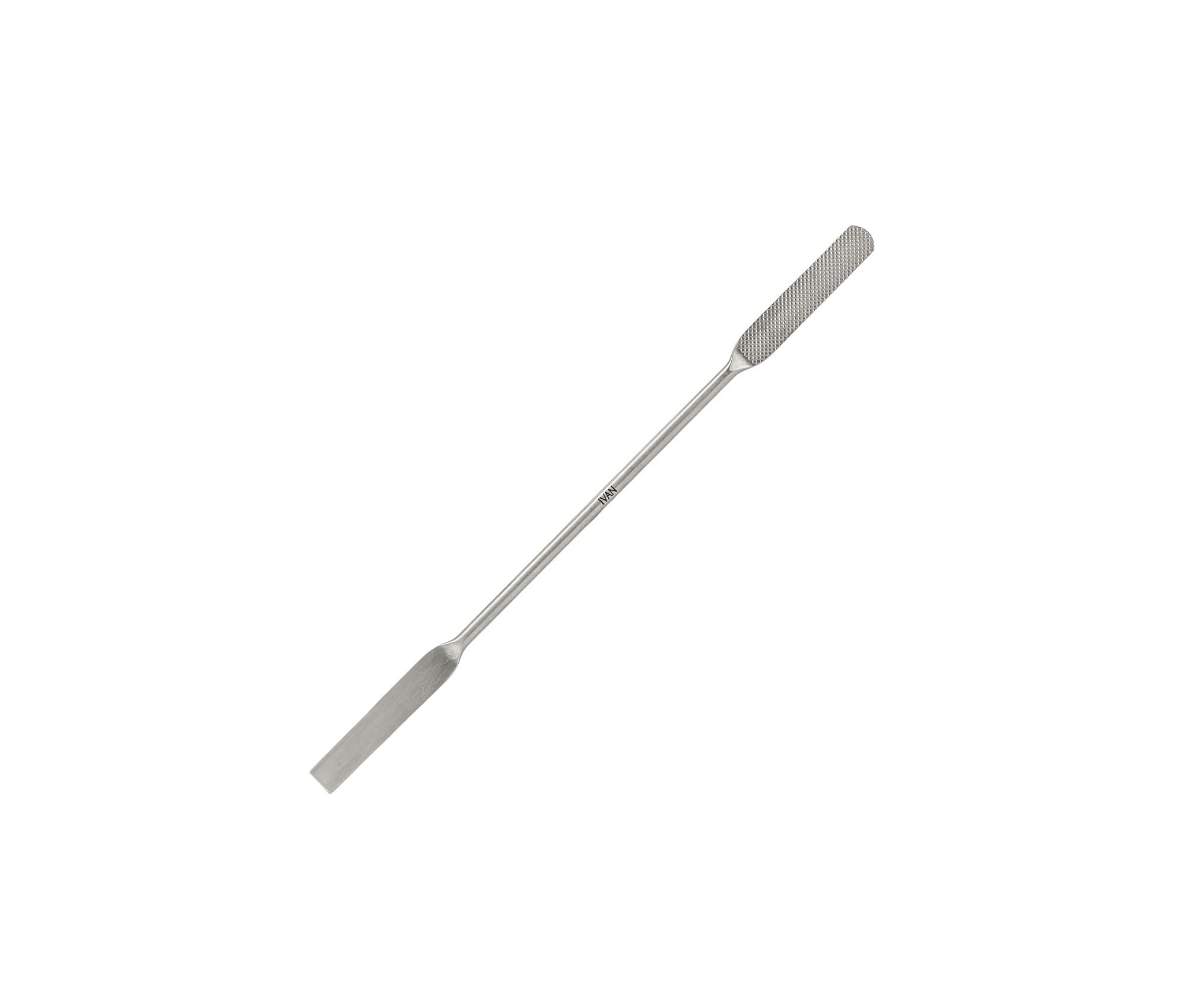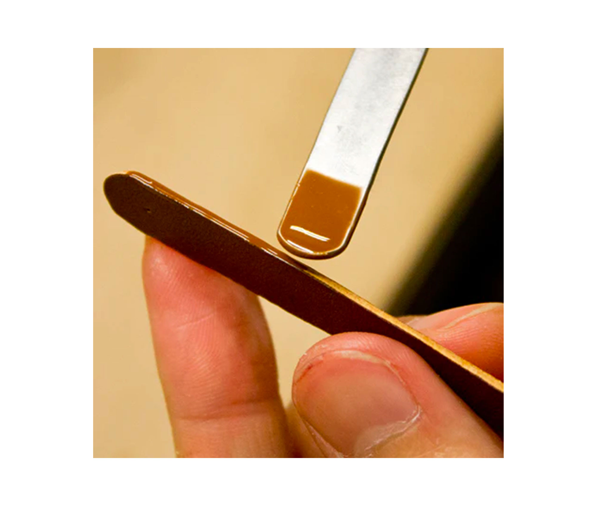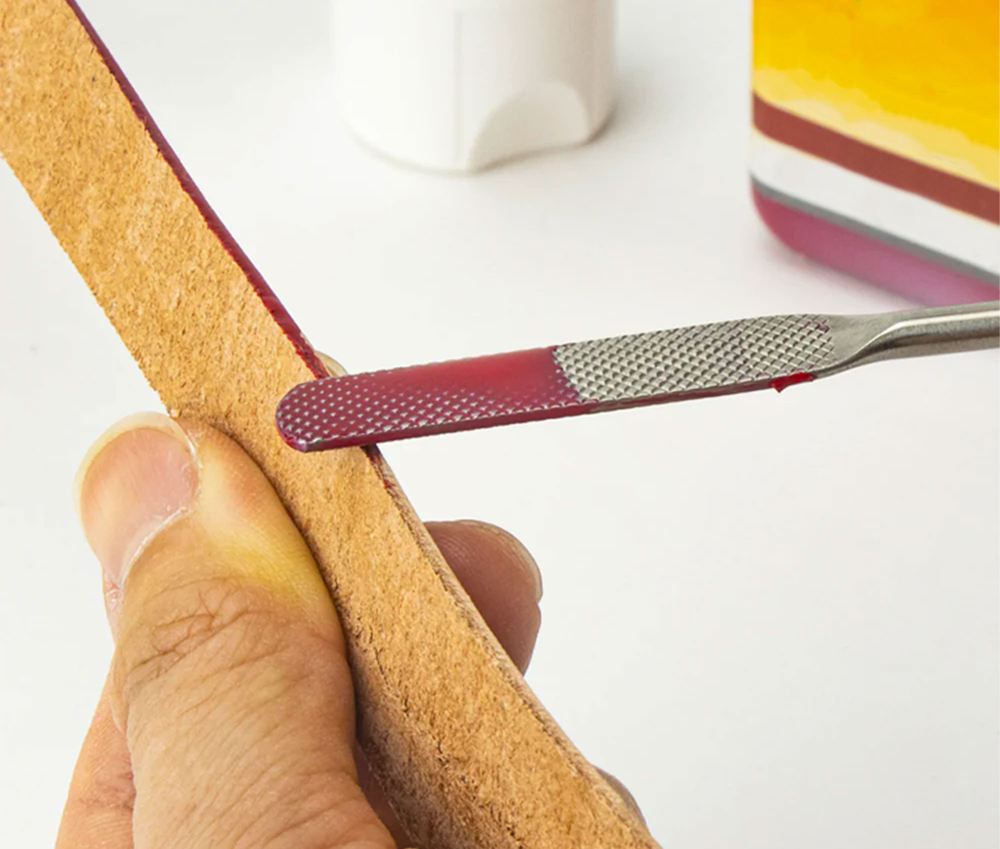 This stainless steel applicator has two heads: one is smooth to apply leather paint or sliced dyes, while the other is gridded to remove an already dry painter or to deposit a new color while eliminating the stringy residues present on the edge of the leather.