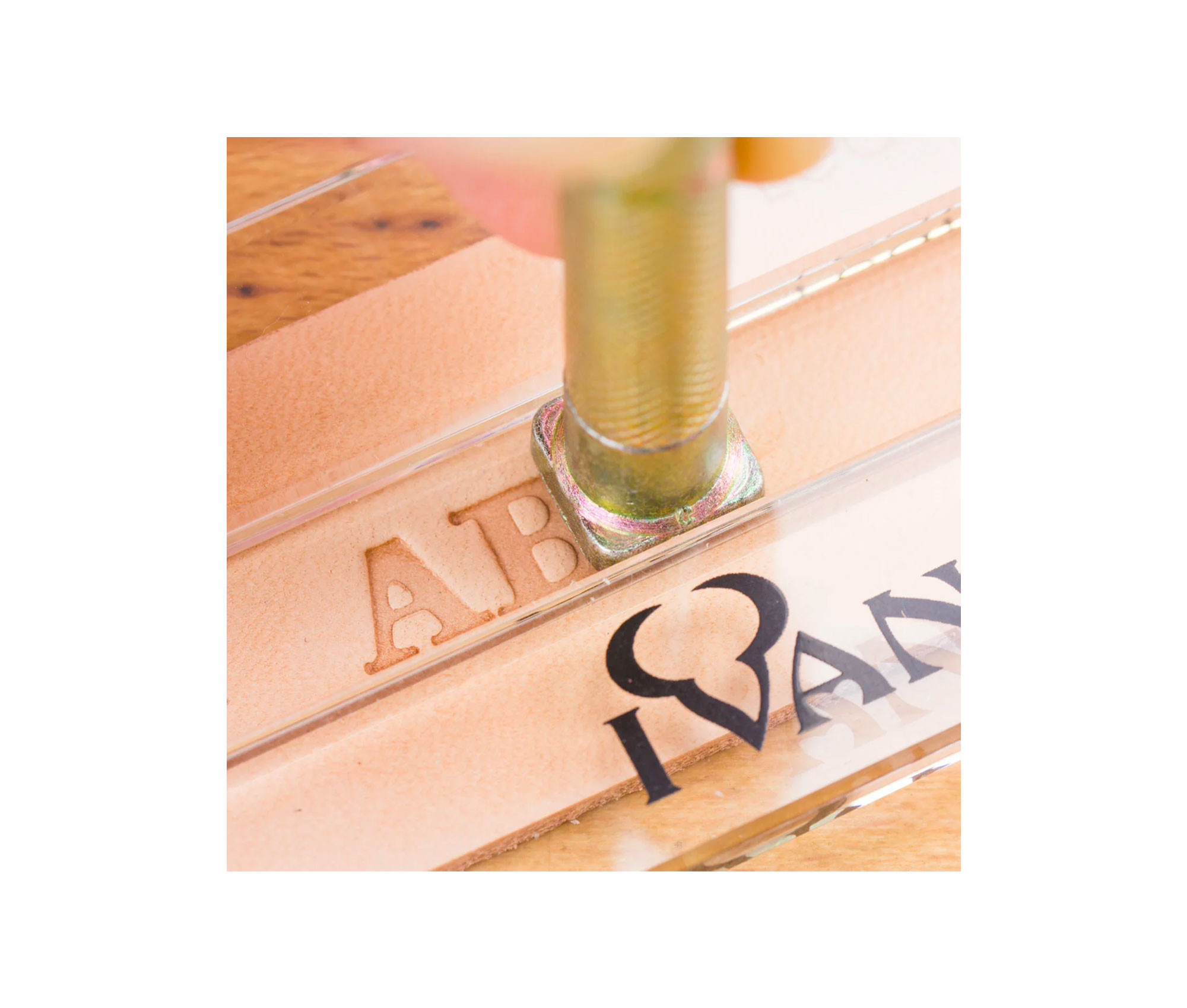 Once your adjustment is made, simply strike while following the alignment to achieve a straight and consistent impression on your leather creations. This guide fits perfectly with IVAN stamps, including the following alphabet and 3D models: IVA-016, IVA-017, IVA-018, IVA-025.