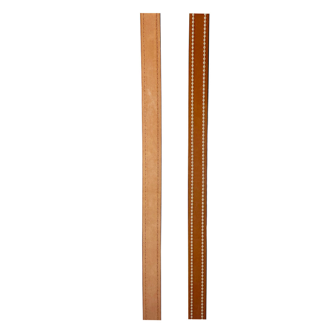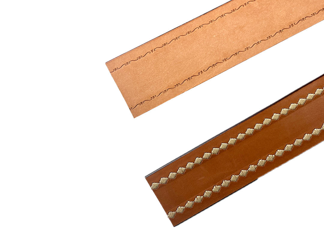 natural vegetable tanned leather reverse with embossed pattern, finished edges on both lengths.
